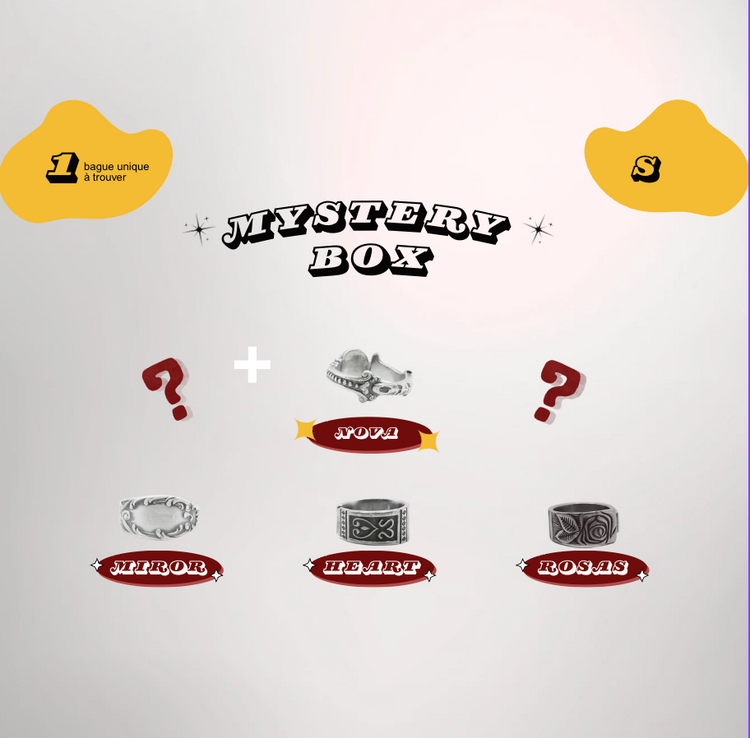 Chaque boîte est différente → tu ne sais jamais sur quoi tu vas tomber, et c’est ça qui rend l’expérience excitante. Nos bagues sont faites à partir de matériaux recyclés, donc en plus d’être originales, elles sont éthiques et responsables.